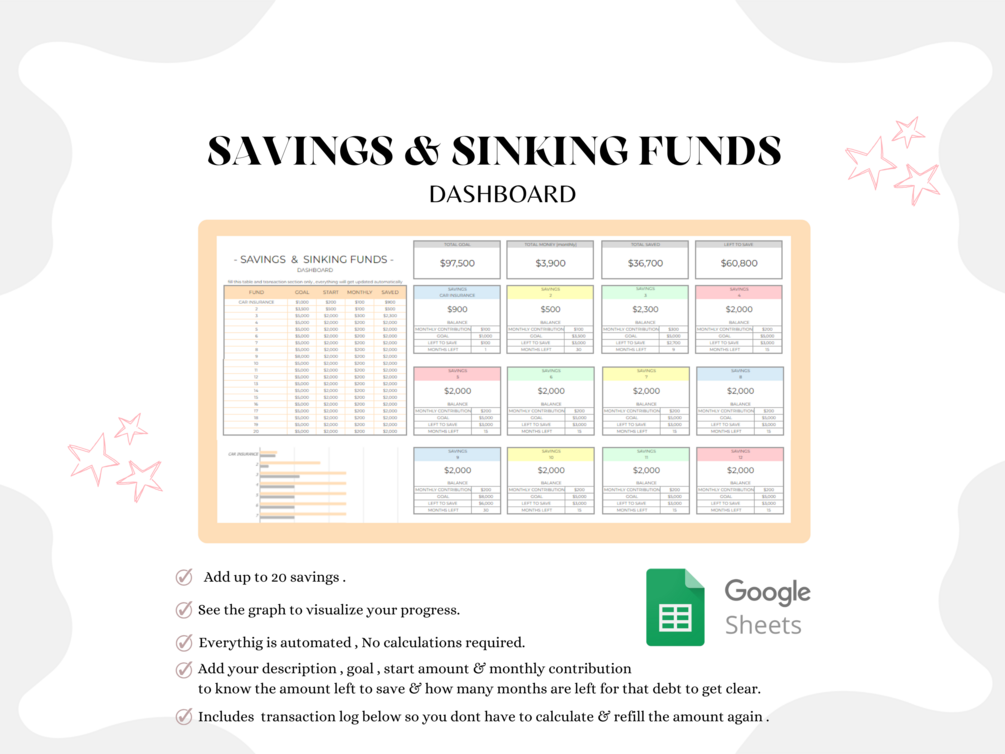 Plan ahead and set goals for future expenses with the intuitive savings and sinking funds tracker.